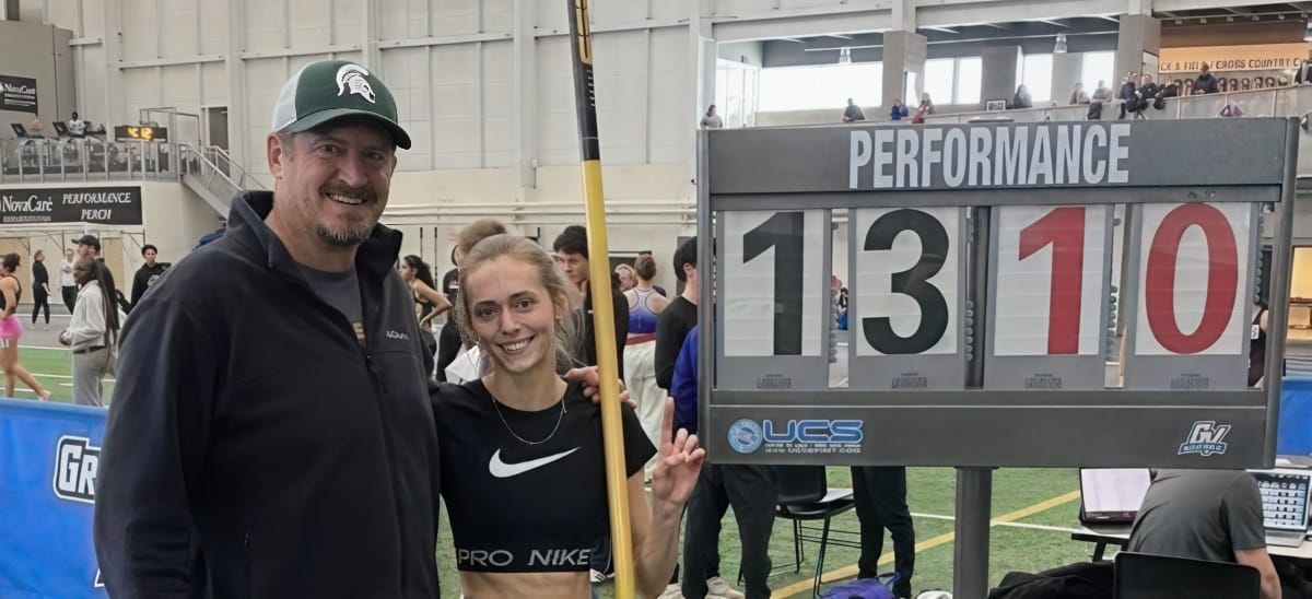 For Katie Blue, vaulting is very much a family project. She comes by it naturally. Both her grandfather and father vaulted as preps in Ohio, and her father, Ryan Blue, went on to become a Mid-American Conference champion in the decathlon for Western Michigan. Her older brother, Adam, is the Grand Ledge record holder for boys at 15-6 and was D1 runner-up in 2022. Now he is an All-Big 10 vaulter for MSU with a best of 17-5.